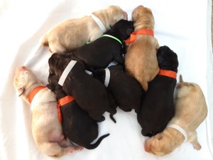 Op 8 juli 2019 zijn de pups geboren. 2 gele reutjes, 2 zwarte reutjes, 2 gele teefjes en 3 zwarte teefjes.