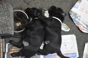 We zijn volop bezig met zindelijkheidstraining. Als de pups ’s morgens wakker worden leggen wij eerst nieuwe kranten in de bak. Ze worden daardoor ge-activeerd, ze dartelen over elkaar heen, doen hun plas en een hoopje. Ondertussen krijgen ze ook drinken. Na een uur is iedereen geweest. De een na de ander gaat languit langs de kant liggen. Rust…..