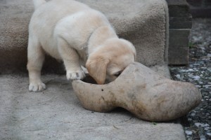 Voor de eerste keer naar buiten. Een hele belevenis. Er is van alles te ontdekken in de tuin: klompen van de baas, een gekke-groene-bezem en kippen. En ook Juneau mag nu dichterbij komen.