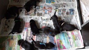 We geven de pups wat meer ruimte, een plekje met kranten waar de pups kunnen plassen en poepen. Het geknisper van de kranten stimuleert de pups. Als ze wakker worden zetten we ze op de kranten en zowaar, allemaal doen ze er een plasje en een hoopje. En zo zijn we begonnen met zindelijkheidstraining.