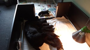 Een paar pups hebben de oogjes een beetje open, we zien hele schattige kleine zwarte kraaloogjes. Het is een uitdaging (nog niet goed gelukt) om dat op de foto te krijgen. Er is zoveel zwart, en de pups zijn zo beweeglijk als ze wakker zijn.