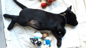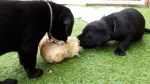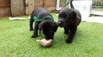 Het is mooi om te zien hoe de pups zich ontwikkelen. Vorige week nog vooral spelen met elkaar, nu zijn ze volop in de weer met speelgoed, het gele knuffelbanaantje, het Kong speeltje (een roze octopus) van Goldilocks, of ze knagen aan een bot.