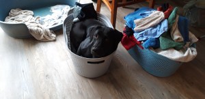 8 oktober 2024 – Om de werpkist te verschonen parkeren we de pups in een wasmand. Dat past nog prima en na wat gerommel vallen de pups over elkaar heen in slaap.