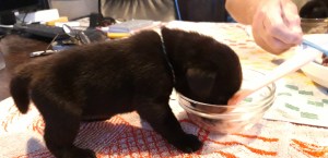 De pups zijn vandaag 4 weken oud, en krijgen hun 2e wormkuur, onder stil protest, dat wel. Meteen daarna krijgen ze een lekker vleesprakje om de pasta gemakkelijker weg te slikken.