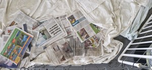 28 oktober 2024 – In een hoekje van de leefruimte van de pups liggen kranten. Dat knispert en ritselt en stimuleert de pups om te plassen of te poepen. Zo leren we ze zindelijk worden. De rode reu en de groene reu lopen er al zelf naartoe, de andere pups draaien er nog wat omheen en zetten we zelf op de krant als ze stil gaan zitten.