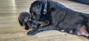 1 oktober 2024 – Elke 2 uur zijn de pups wakker en gaan ze op zoek naar een tepel. Een enkele piept alleen maar, die helpen we dan een beetje door hem aan te leggen. Tijdens het drinken, maar ook tussendoor pakt Juneau een pup bij zich om deze te verzorgen.