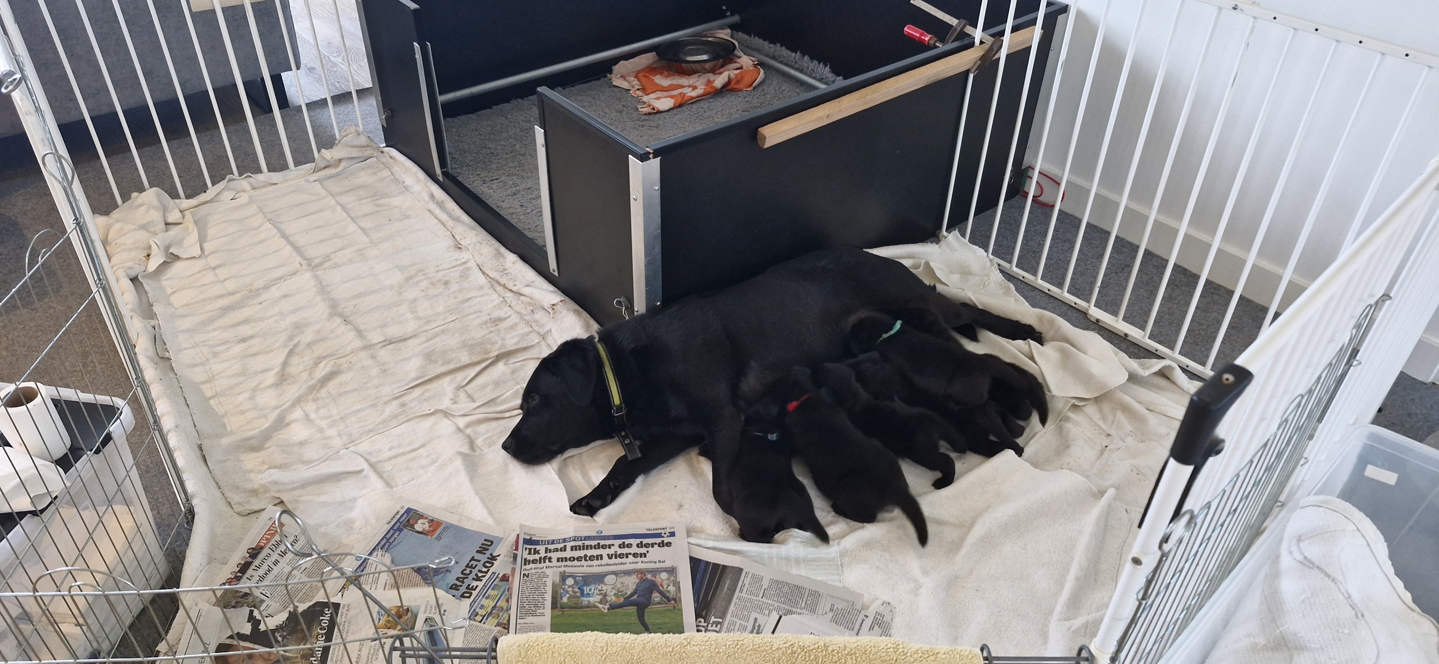 Fokker van zwarte en gele labradors