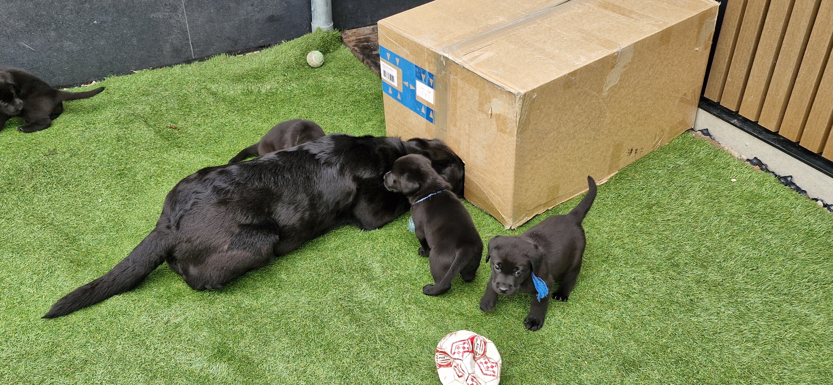 Fokker van zwarte en gele labradors